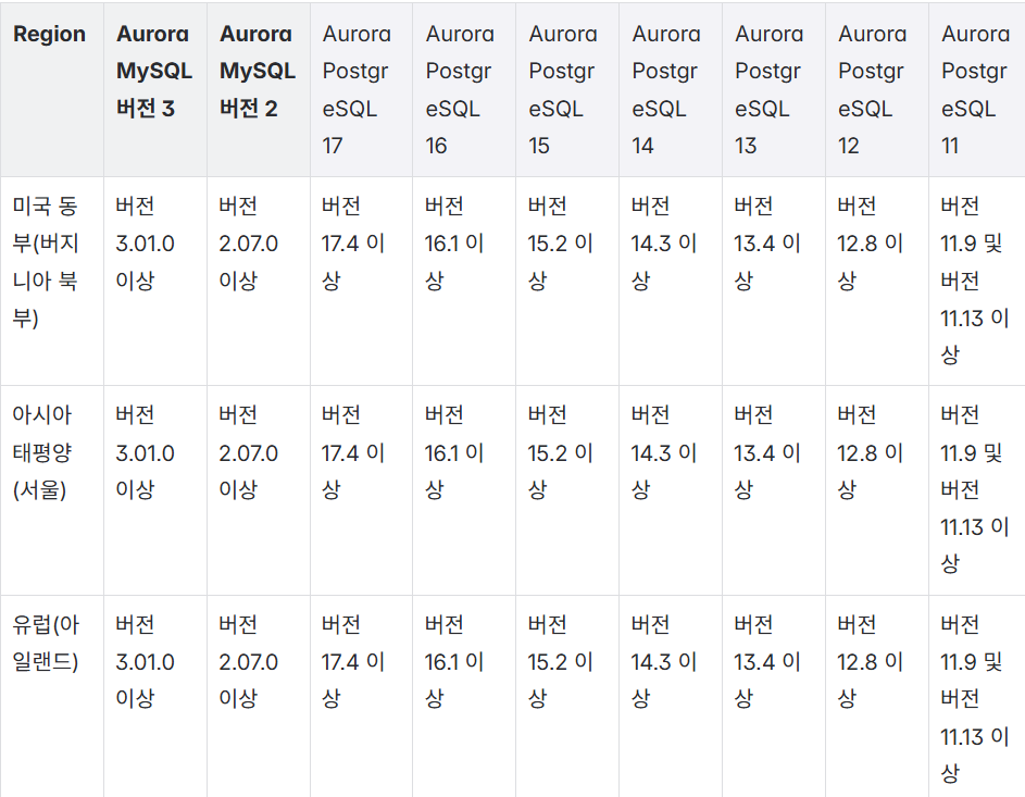 - Secondary Region 지원 확대: 최대 10개 Secondary Regions 가능 (2025년 5월 발표) Amazon Aurora Global Database introduces support for up to 10 secondary Regions | AWS Database Blog