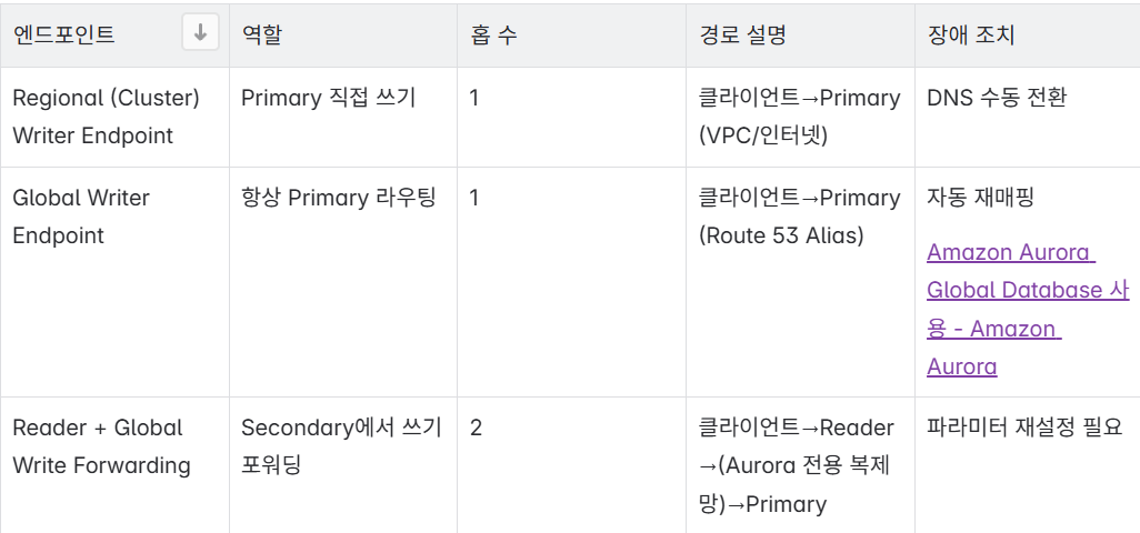 | Global Writer Endpoint만 사용 | Writer endpoint → A의 Writer로 연결 | Writer endpoint → B의 Writer로 자동 전환 |