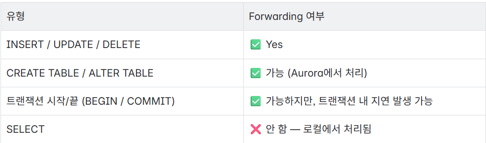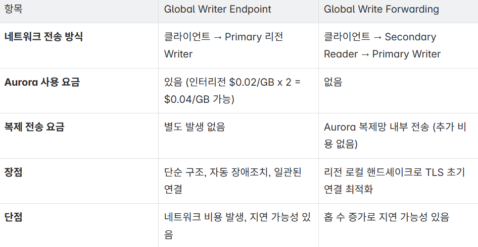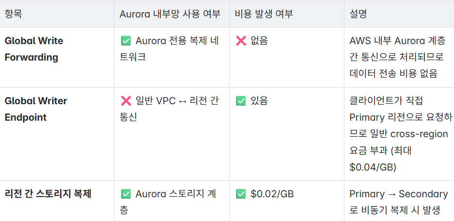 ✅ Global Write Forwarding은 Aurora 내부 복제망을 사용하므로 추가 네트워크 비용이 발생하지 않습니다.