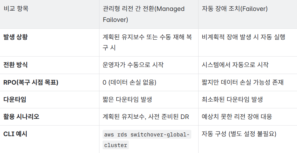 Aurora Global Database는 두 가지 방식의 리전 간 장애 조치 기능을 제공합니다.
