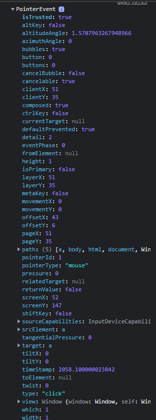 - link의 기본 동작을 막은 후 Event의 정보를 보면 아래와 같이 볼 수 있다.