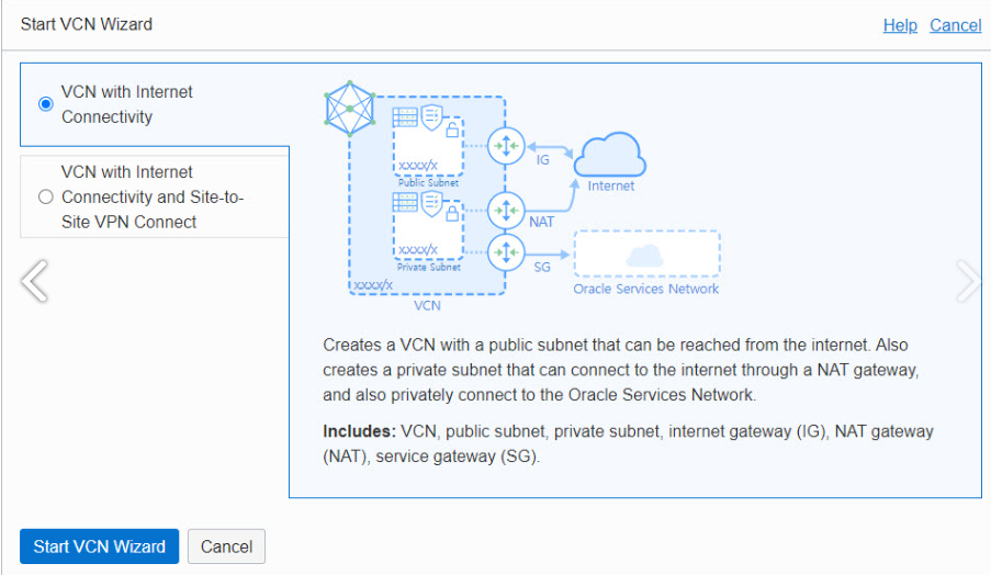 - OCI의 VCN 구성에 익숙한 사용자가 아니면 "Start VCN Wizard"를 클릭하자