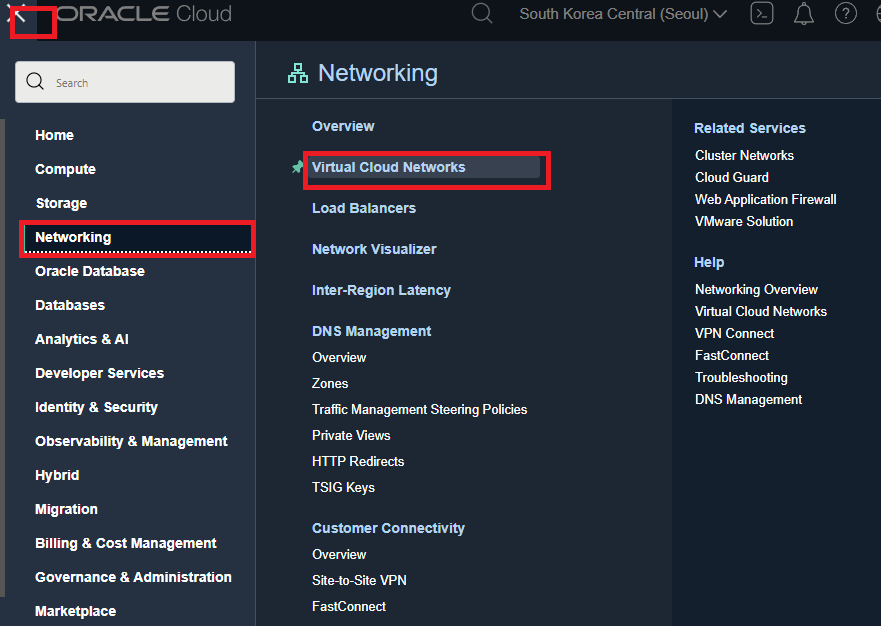 - 왼쪽 위 구석의 햄버거를 클릭 한 후 --> Networking --> Virtual Cloud Networks로 이동한다.