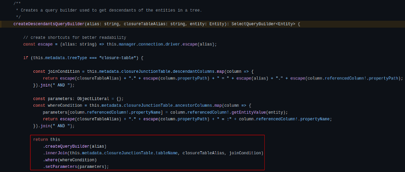 Finally, what you need to remember is createDescendantsQueryBuilder and where cannot stick together. PERIOD